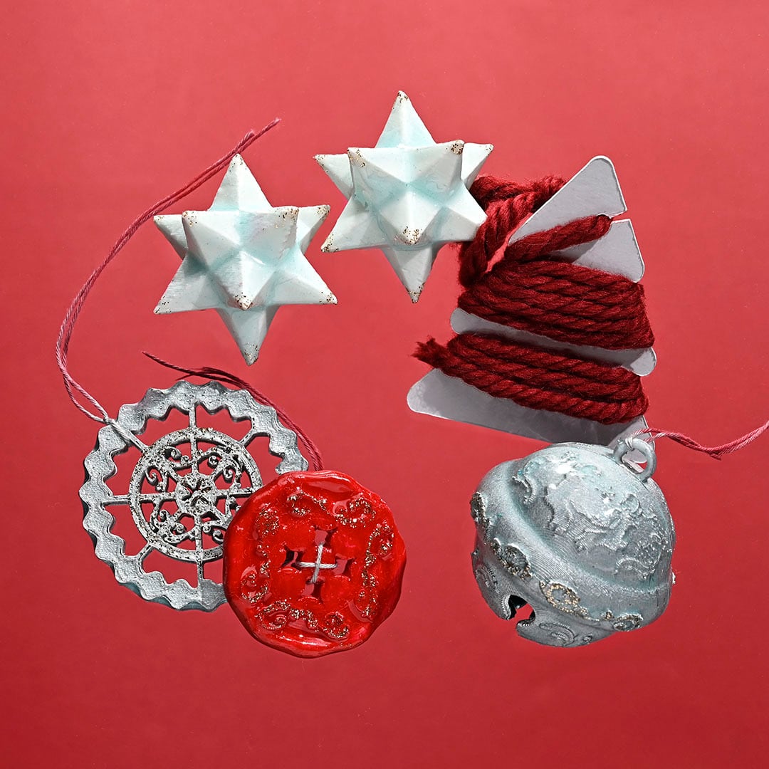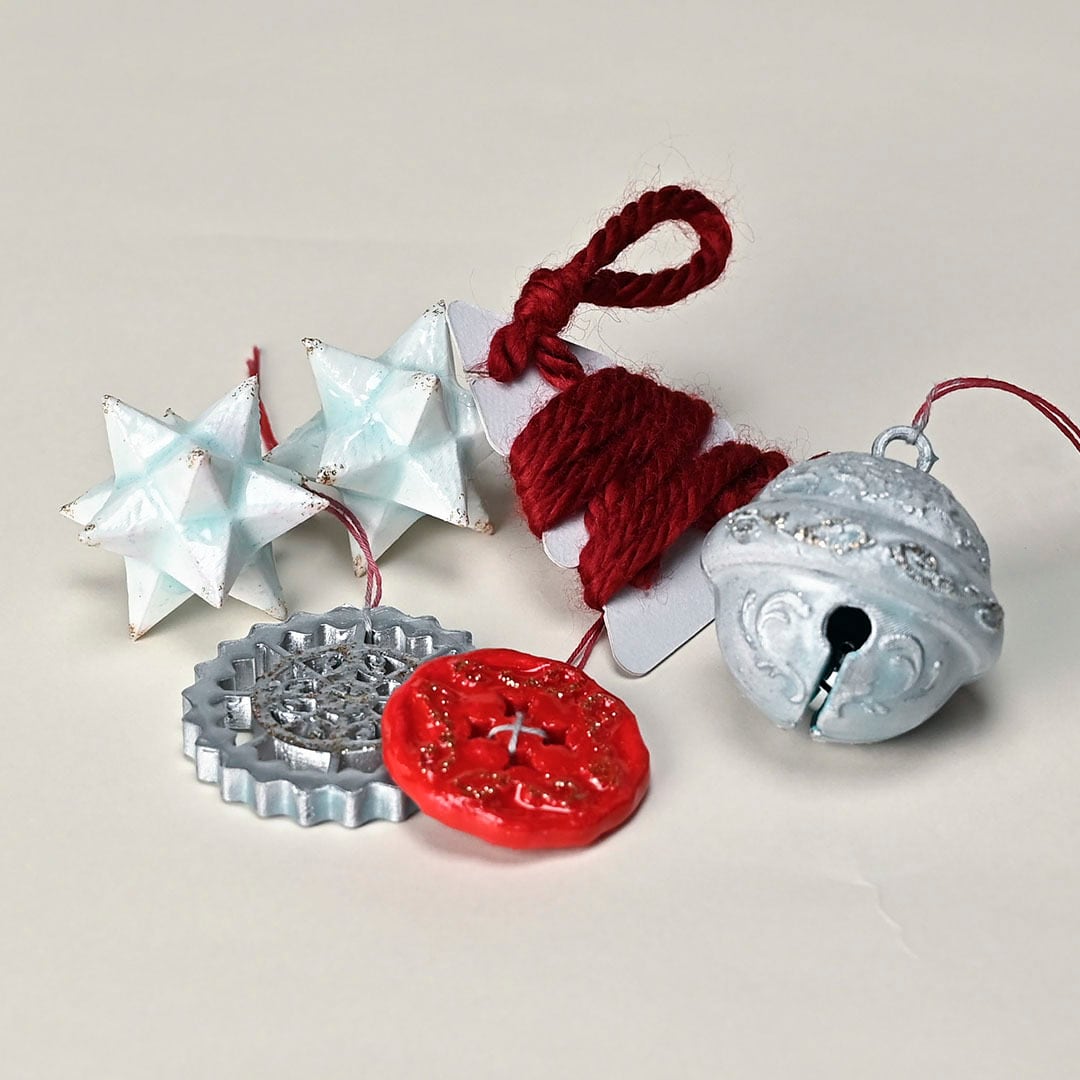サンタのスズ、ボタン、時計の歯車、赤い毛糸、夜空の星、5つの落とし物をガーランドにできるセット